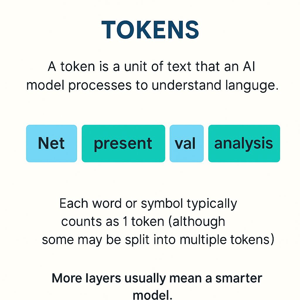AI breaks down language into tokensâchunks of words. âFinanceâ = 1 token. âNet present value analysisâ = 4-5 tokens. Many tools bill by token.