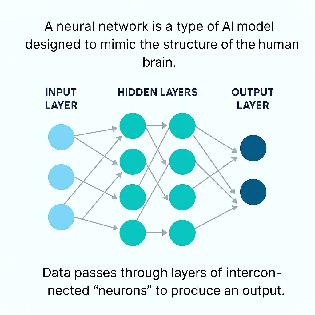 These are algorithms designed to mimic the human brainâs structure. They take inputs, run them through âneurons,â and produce smart outputs. The more layers, the deeper (and usually smarter) the analysis.